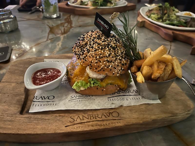 The food was very good here. Three of us had the wagyu beef burgers and they were delicious. They came with a small amount of fries which was appreciated, since they wouldn't go to waste.....like other establishments giving huge servings. (People have to remember large servings does not mean good food!!) Anyway some things that should be pointed out: the menu shows the ability to get "extra" shrimp with your burger for 90 pesos. The way it's worded makes you expect you're getting shrimp with your hamburger but you're not. Actually one of us at the table ordered shrimp with the burger and never got it. We just ignored it, as it didn't really matter. The other thing on the menu said there were pickles on the burger which I was happy about, but there were no pickles when it was put in front of me. The dessert was delicious and very beautifully presented. I would go back because the food was so good. The service could have been a bit more attentive, and note that although the wagyu beef burger was delicious it was quite expensive.